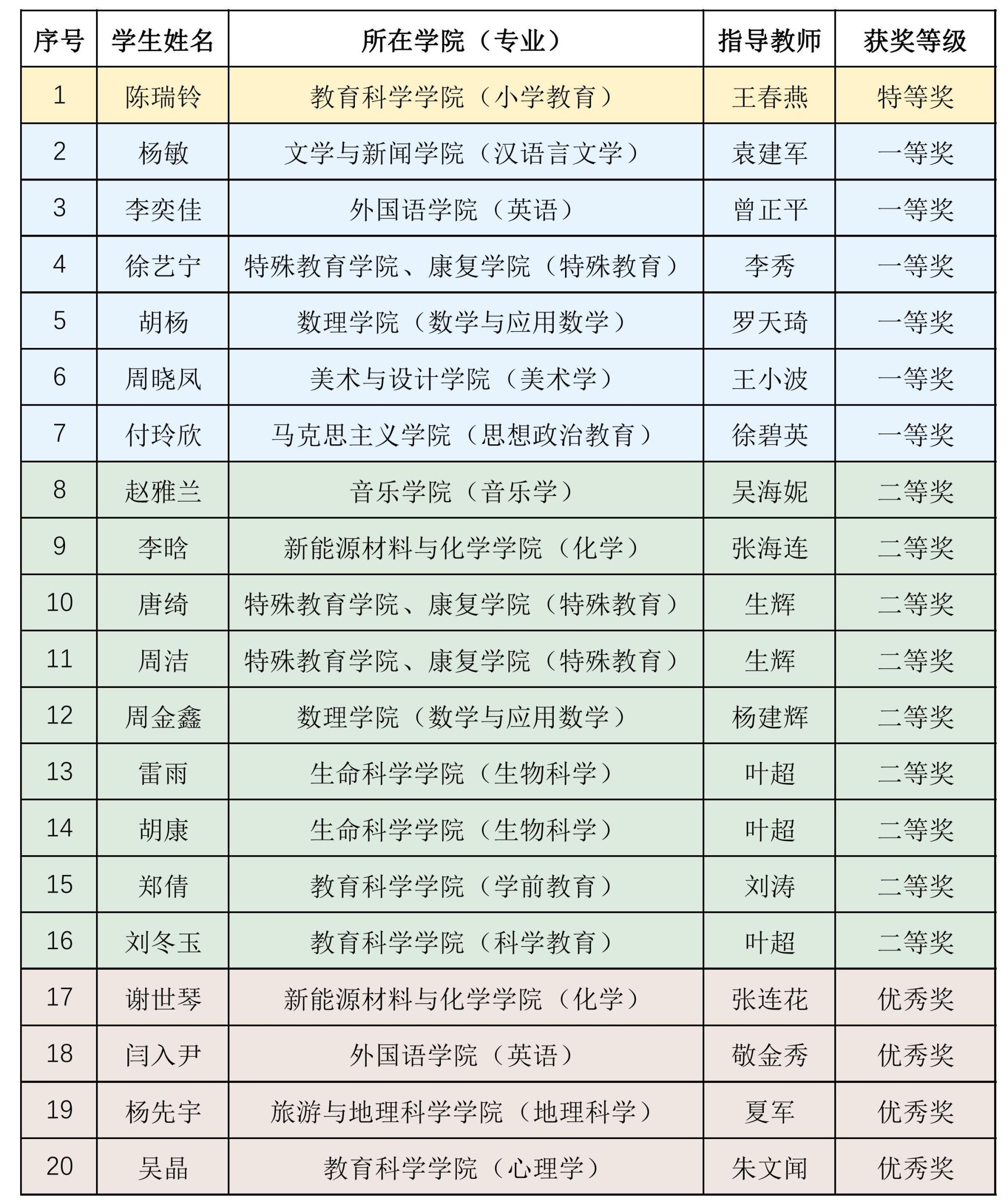 此次大赛经各院校初赛推荐,组委会专家评审,共评选出特等奖135个、一等奖314个、二等奖914个、优秀奖1299个。经过激烈地角逐,我校来自教育科学学院、文学与新闻学院、马克思主义学院、外国语学院、数理学院、生命科学学院、新能源材料与化学学院、旅游与地理科学学院、美术与设计学院、音乐学院以及特殊教育学院、康复学院的20位同学全部获得奖项。大赛组委会根据比赛作品的获奖情况,评选出73所“优秀组织院校”,我校荣获此殊荣。组委会评选出126位“优秀指导教师”,教育科学学院教师王春燕获此荣誉。