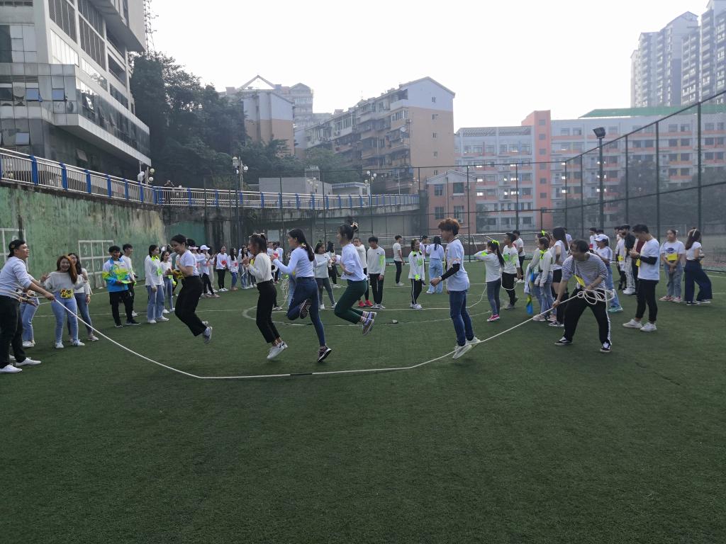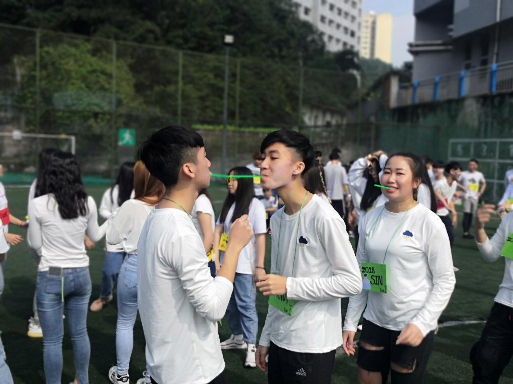 同学们首先作了自我介绍,以增进了解。彼此熟悉之后,同学们开展了集体跳绳、吸管运输、端粉、数字组合等活动。集体跳绳增强了新老生的归属感与凝聚力。吸管运输是用嘴衔住吸管传递橡皮筋,最后比拼皮筋数量的方式来测试同学们的团结程度。端粉游戏则是要求每组第一个人把盘子里的白灰举过头顶,传到最后一个人,然后以最后一位同学盘子里的白灰量决定胜负。最后的数字组合游戏要求同学们根据主持人所给数字组成一个团体并抱在一起。如果有人落单,那么就会被抹颜料。