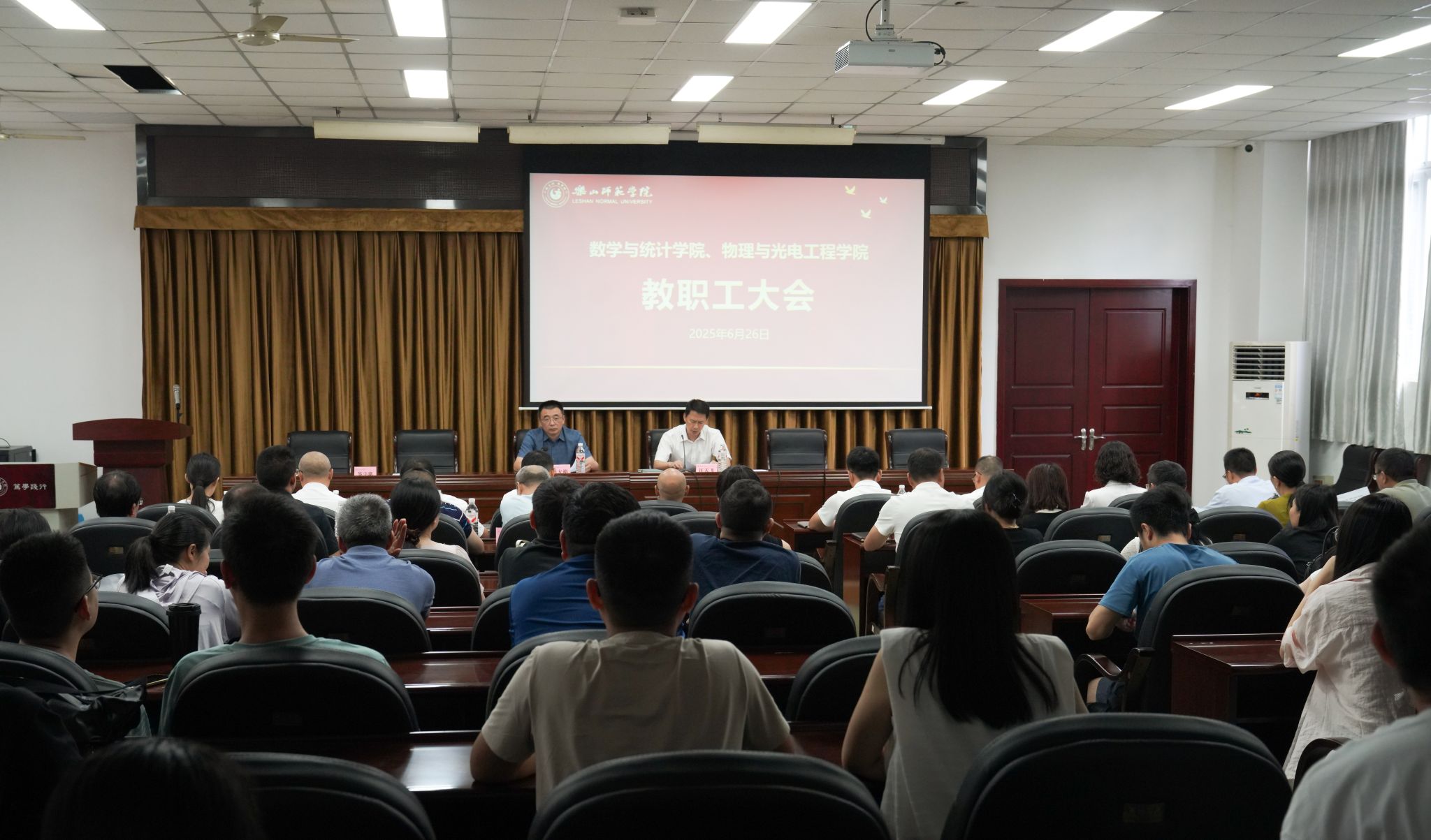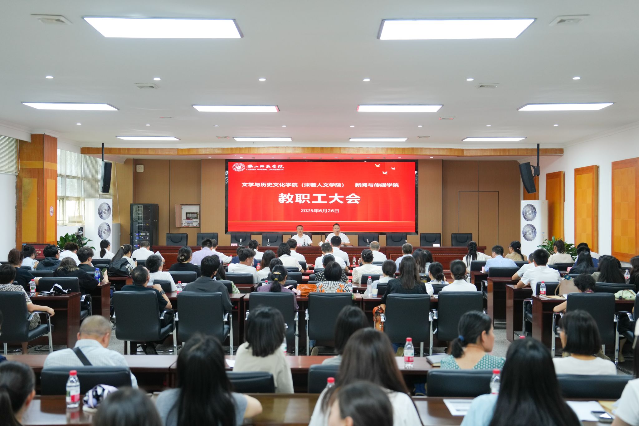 本网讯(文图/孟繁增、杨爽)6月26日,文学与历史文化学院(沫若人文学院)、新闻与传媒学院、数学与统计学院、物理与光电工程学院举行教职工大会,四个教学院宣告正式成立,这标志着学校在优化学科专业布局、深化内涵特色发展上,迈出了具有里程碑意义的关键一步。校党委书记刘进出席文学与历史文化学院(沫若人文学院)、新闻与传媒学院教职工大会并讲话,校党委副书记、校长李方裕出席数学与统计学院、物理与光电工程学院教职工大会并讲话。校党委副书记陈一君、校党委常委、副校长汪天飞分别宣读《关于调整部分教学院以及二级党组织设置的通知》以及干部任免决定。