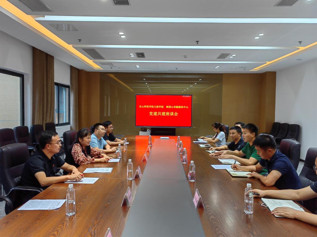 本网讯(文图/周淞铖)9月8日下午,文学与新闻学院传媒党支部与峨眉山市融媒体中心党支部举行党建共建座谈会在峨眉山市融媒体中心大楼五层会议室举行。文新学院党委书记彭杨,党委副书记、纪委书记胡平建,党委委员、副院长杨晓军,党委委员、传媒系教工党支部书记周淞铖,党员教师代表王立元与峨眉山市党委宣传部副部长阮建军、峨眉山市融媒体中心主任余进等进行会谈。