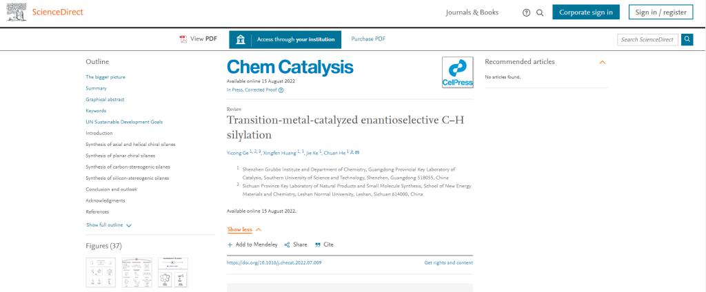 本网讯(文、图/葛怡聪)8月15日,我校新能源材料与化学学院(以下简称“学院”)青年教师、四川省天然产物化学与小分子催化重点实验室成员葛怡聪博士以第一作者(乐山师范学院为第二单位)与南方科技大学(第一单位)在材料化学领域王牌期刊Chem子刊Chem Catalysis在线合作发表了综述性研究论文Transition-metal-catalyzed enantioselective C-H silylation(Chem影响因子为25.832,Chem Catalysis的非官方预测影响因子为22.804),这是学院自成立以来发表的影响因子可能最高的论文,也是首次以有机硅化学为主题发表的SCI综述性论文,表明我校在该领域的研究成果获得了国际同行认可。